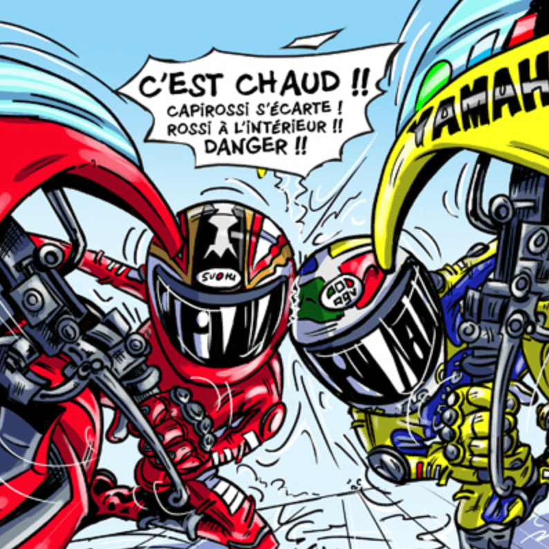 A aujourd’hui 42 ans, il tourne avec des pilotes qui n’étaient pas nés lorsqu’il a gagné sa première couronne. Une vraie légende vivante!! Il fallait bien une BD sur Rossi… C’est Sandro Garbo qui s’y est collé et c’est plutôt réussi.